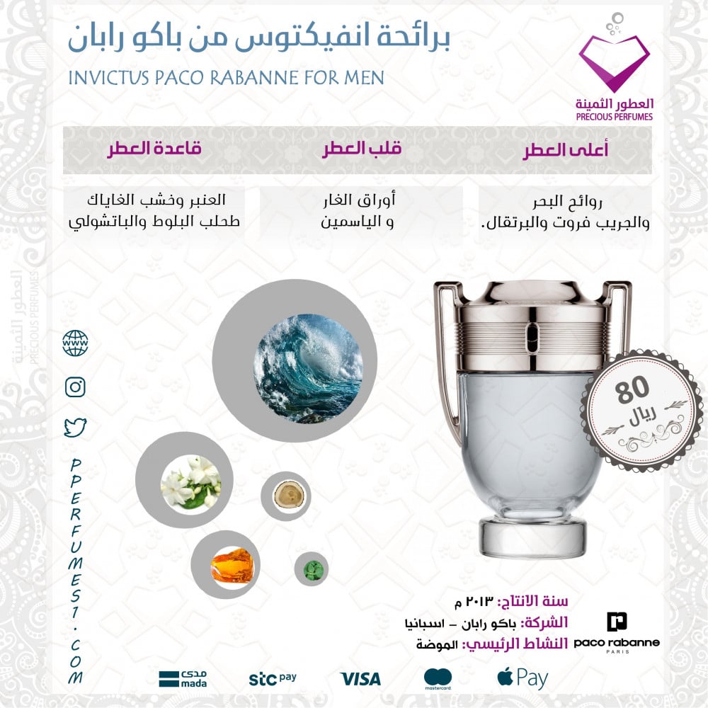 عطر Invictus من باكو رابان هو عطر خشبي مائي للرجال. تم إطلاق Invictus في عام 2013. تم إنشاء Invictus بواسطة Veronique Nyberg و Anne Flipo و Olivier Polge و Dominique Ropion. مقدمة العطر روائح البحر والجريب فروت والبرتقال. قلب العطر أوراق الغار و الياسمين؛ الروائح الأساسية هي العنبر وخشب الغاياك وطحلب البلوط والباتشولي.